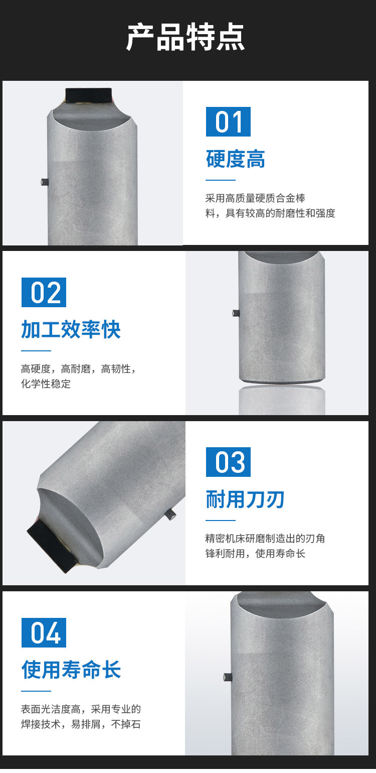 1.硬度高:采用高質(zhì)量硬質(zhì)合金棒料,具有較高的耐磨性和強度;