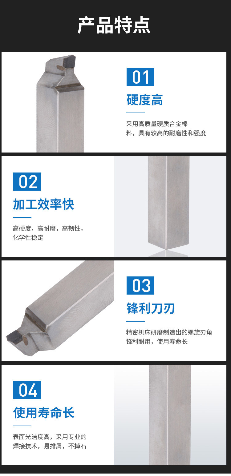 1.硬度高:采用高質(zhì)量硬質(zhì)合金棒料,具有較高的耐磨性和強(qiáng)度;