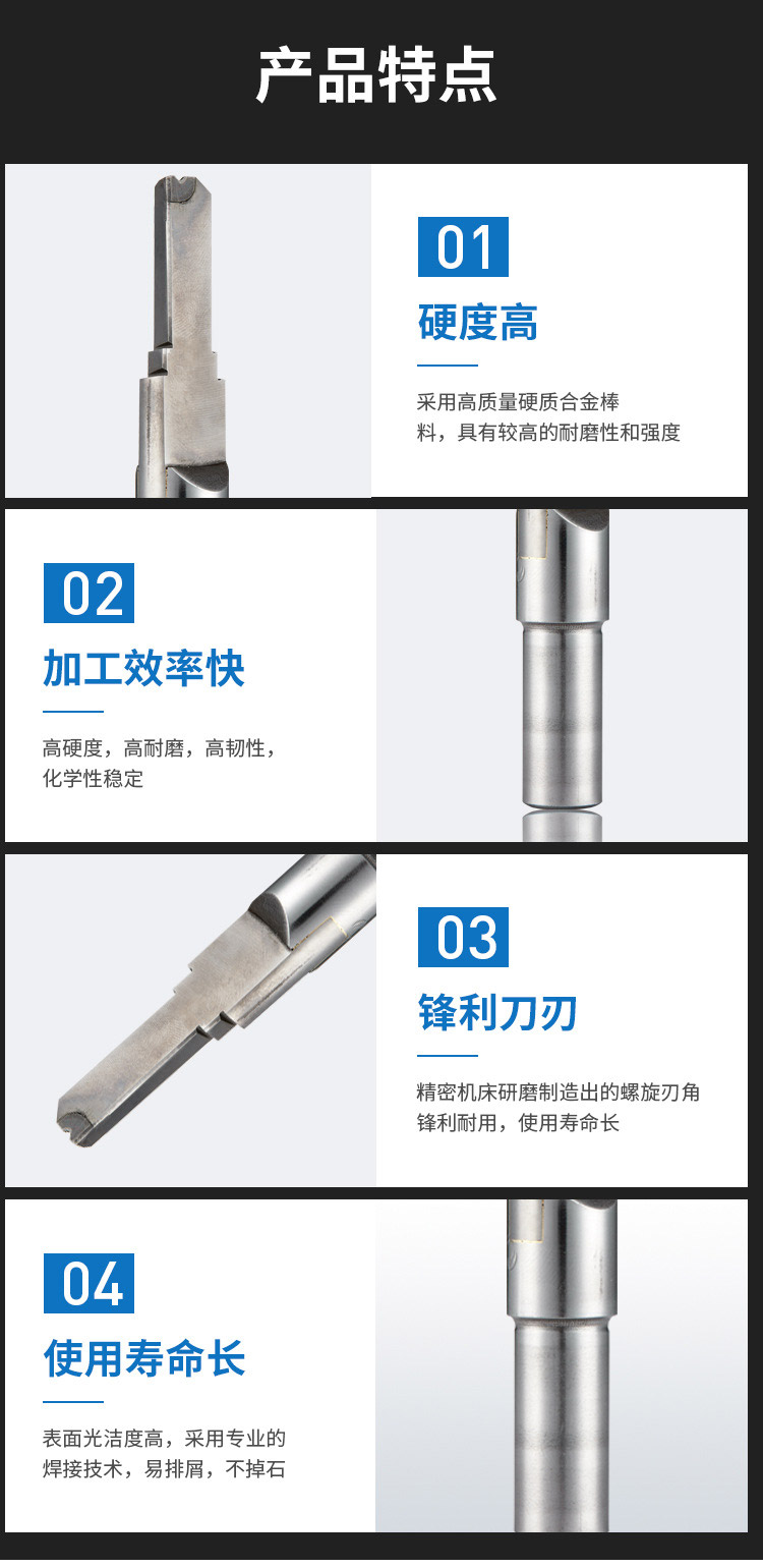 1.硬度高:采用高質(zhì)量硬質(zhì)合金棒料,具有較高的耐磨性和強(qiáng)度;