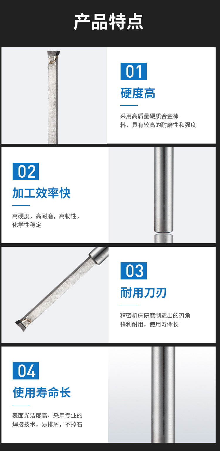1.硬度高:采用高質(zhì)量硬質(zhì)合金棒料,具有較高的耐磨性和強度;