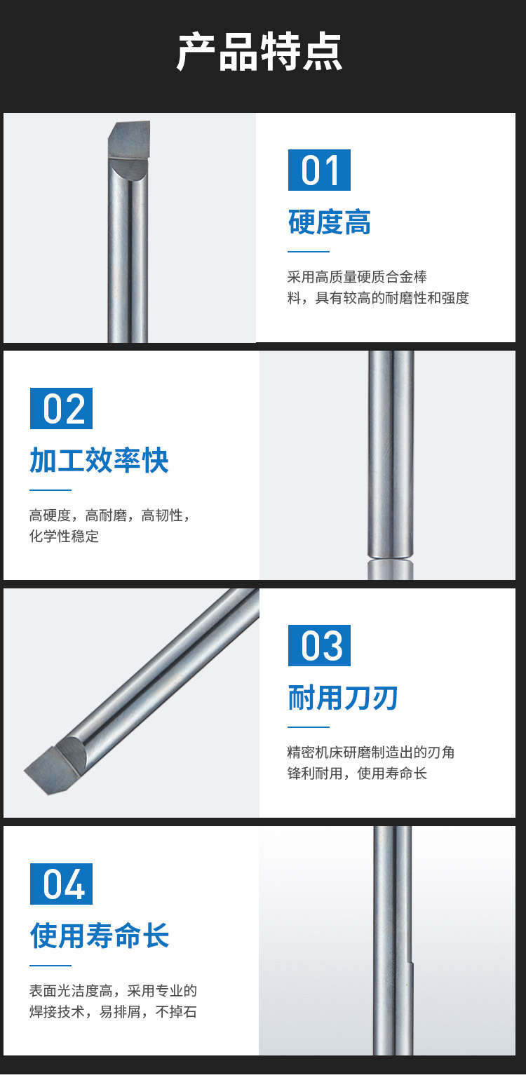 1.硬度高:采用高質(zhì)量硬質(zhì)合金棒料,具有較高的耐磨性和強度;