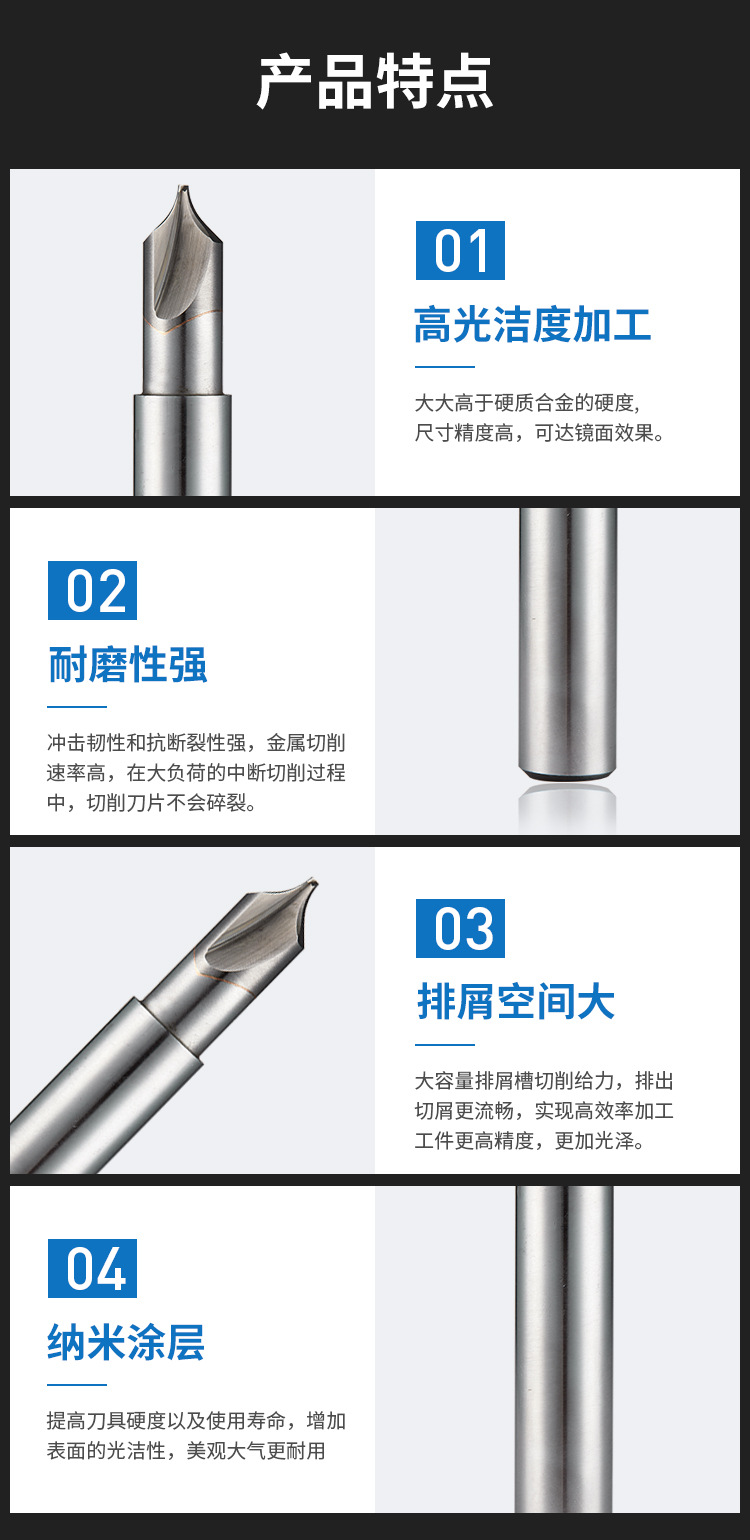 1.高光潔度加工:表面光潔無缺,刀刃更穩(wěn)固不容易崩裂減少換刀,提高效率;