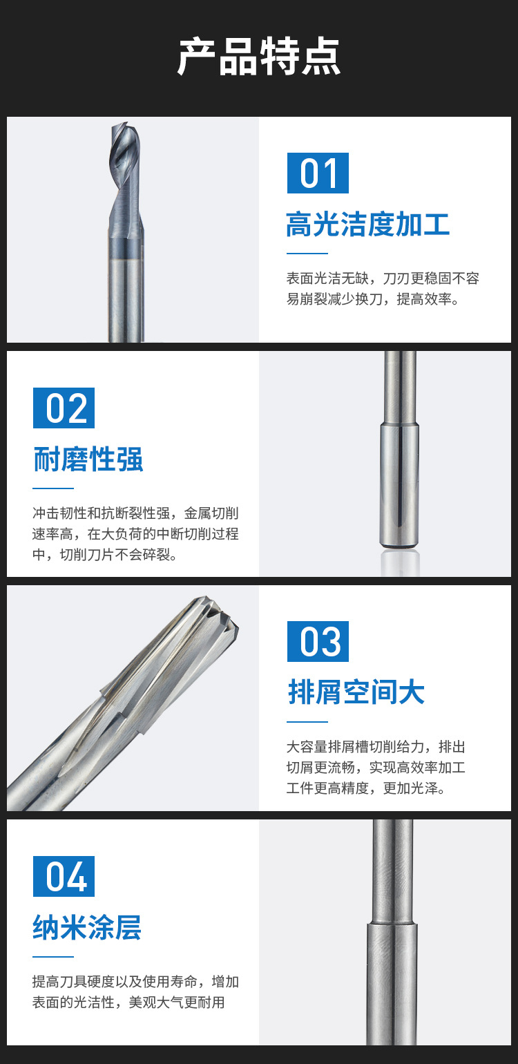 1.高光潔度加工:表面光潔無缺,刀刃更穩(wěn)固不容易崩裂減少換刀,提高效率;
